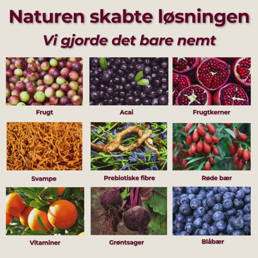 Vores frugt- og bærblanding indeholder blandt andet gojibær, camu-camu, açaí, granatæble, papaya og cordyceps. Mange af disse frugter er sjældne i en almindelig dansk kost – derfor har vi samlet dem i én praktisk blanding.